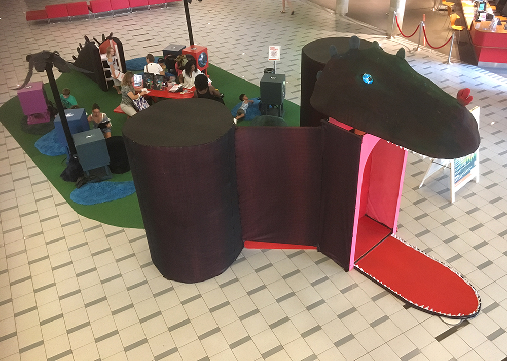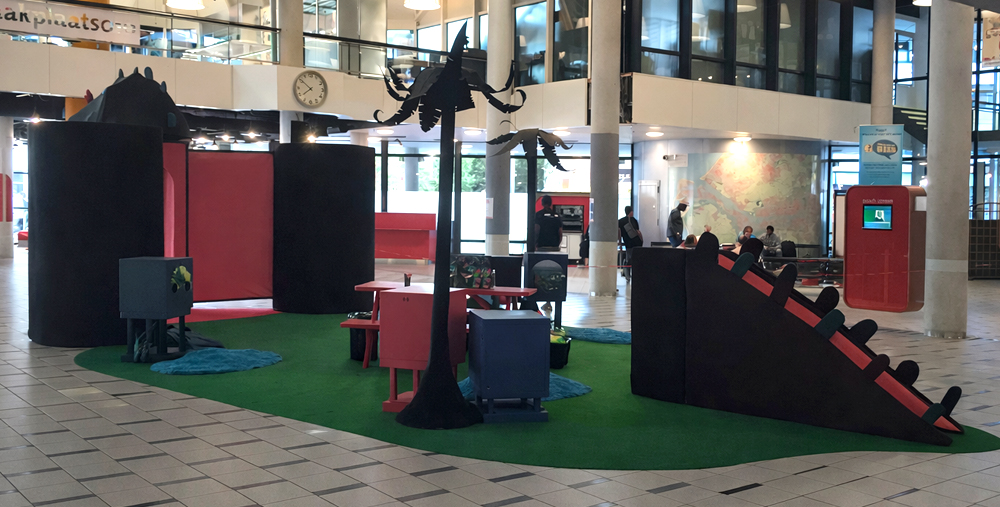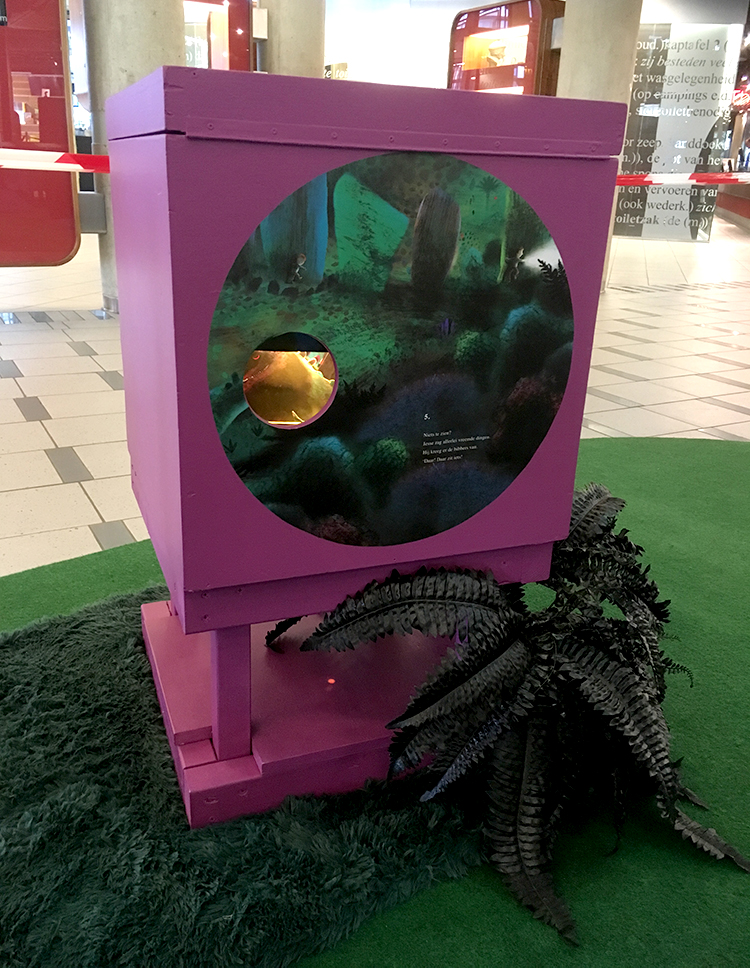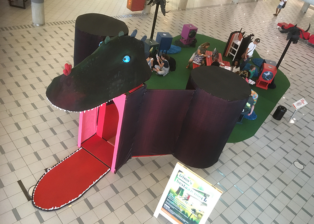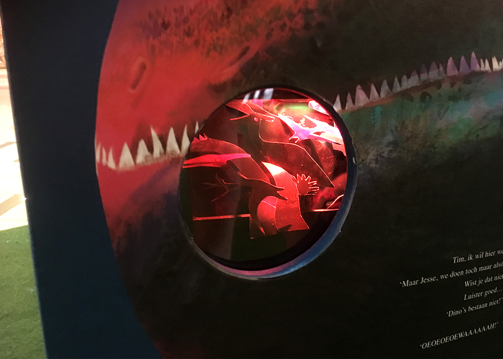 Summer exhibition for the Rotterdam Library, inspired by the book Dino’s bestaan niet! by Mark Janssen, published by Lemniscaat.