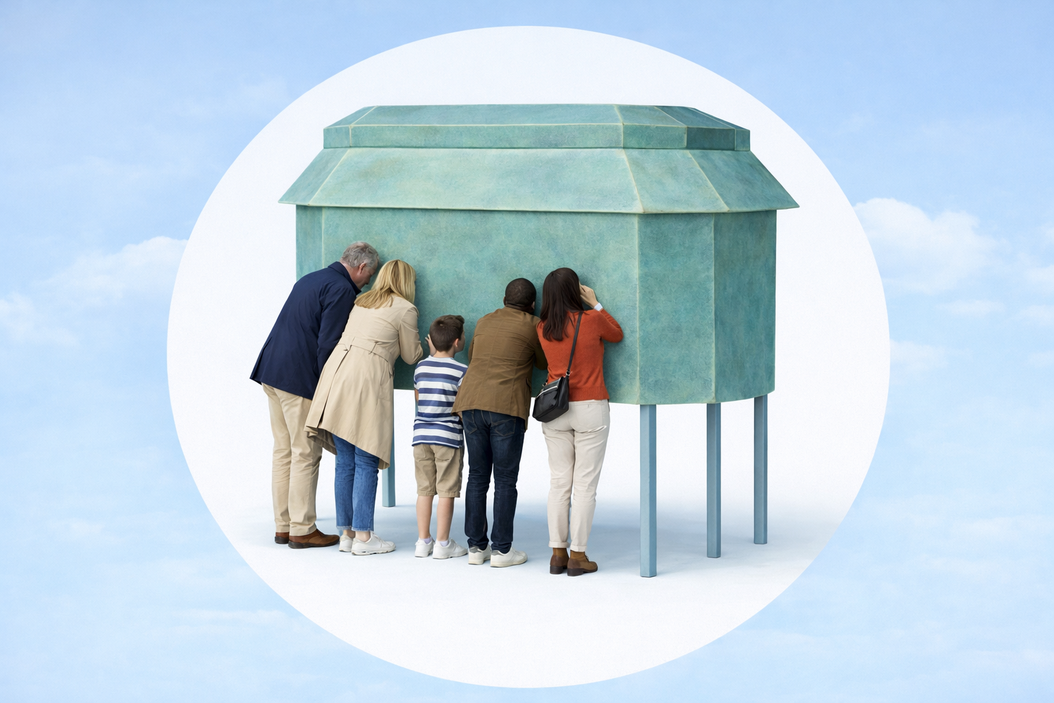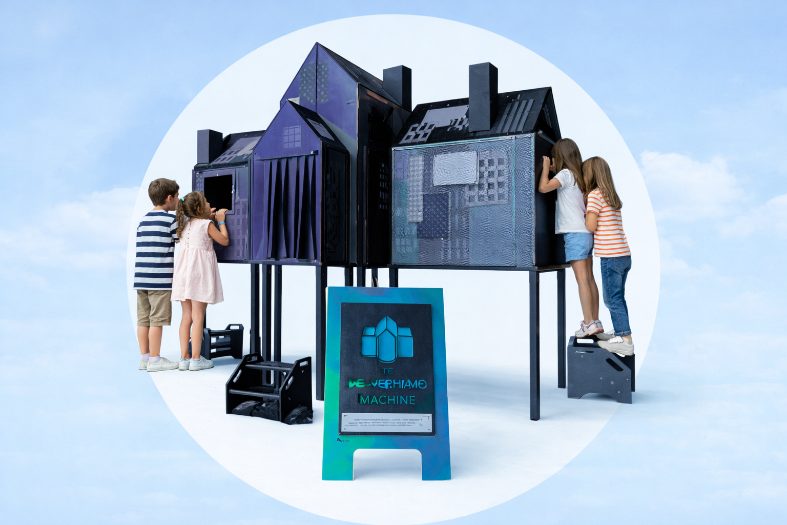 From the outside, this machine looks industrial, with a heavy, dark structure and chimneys puffing smoke. But peek through one of the hatches, and you’ll discover a burst of sweet colors—bright marbles rolling through intricate paths, cheerful carousels spinning, and lively movements and sounds inviting you into the joyful chaos. The contrast between the exterior and interior highlights the delightful uselessness of being unproductive.