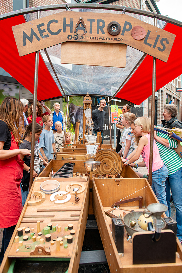 Mechatropolis is an interactive low-tec installation in which you let metal balls roll, spin, twist and jump through a large wooden marble track full of mechanics. All parts, including a maze, a magnetic lift, a puzzle with gears and a track with musical instruments are linked to each other, so you will complete the entire track. Playing, visually discovering and practical puzzling are key.