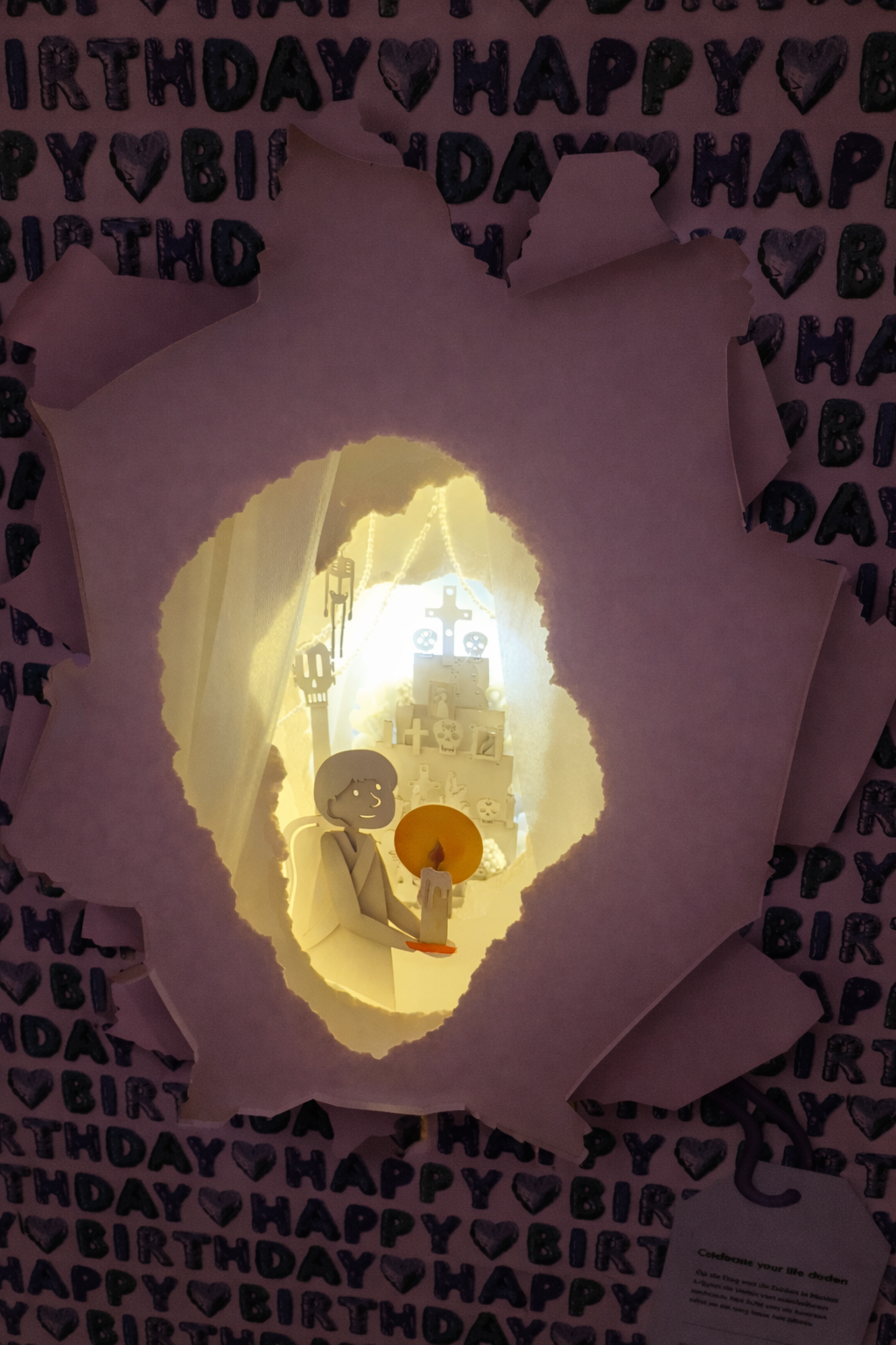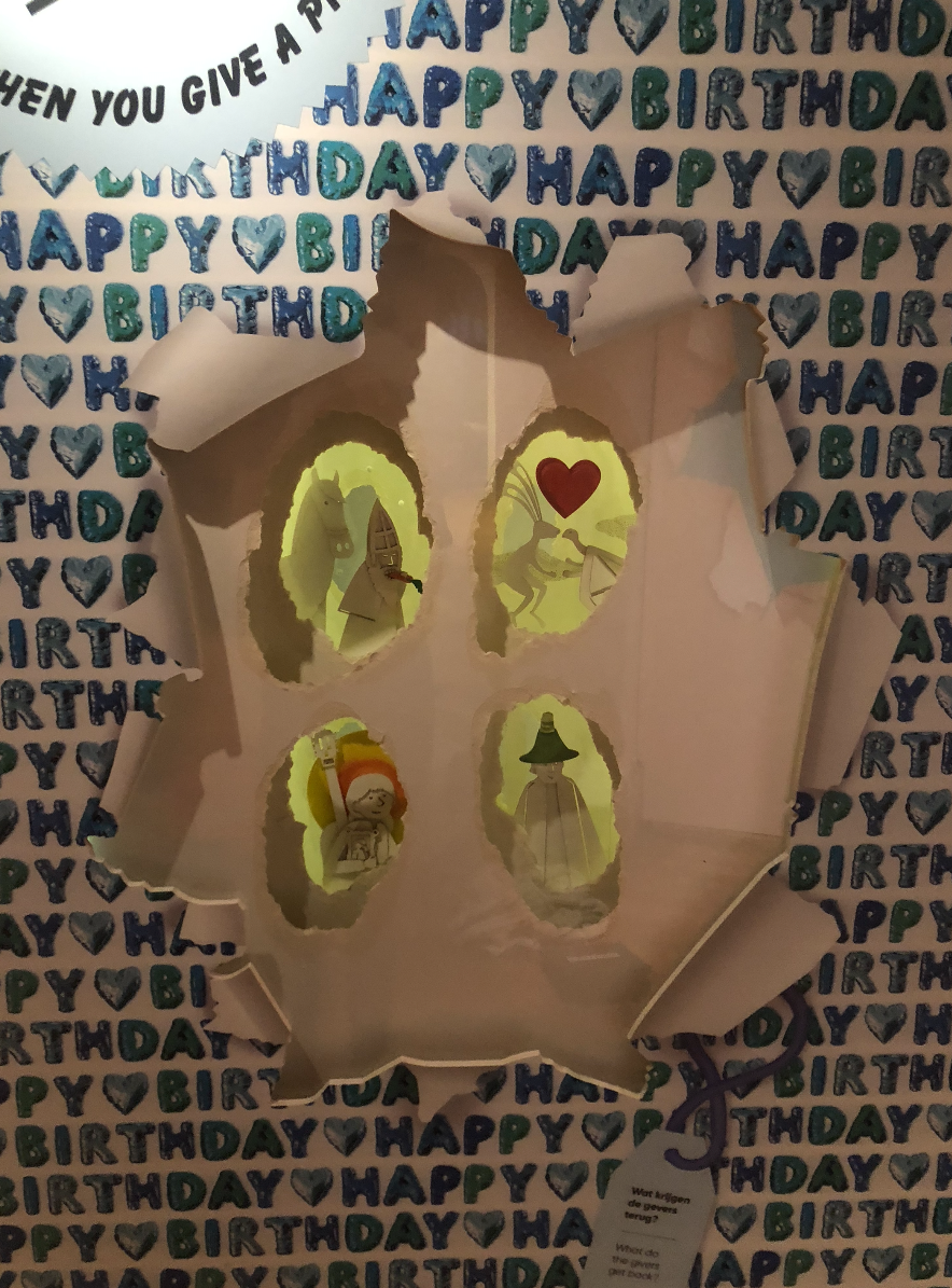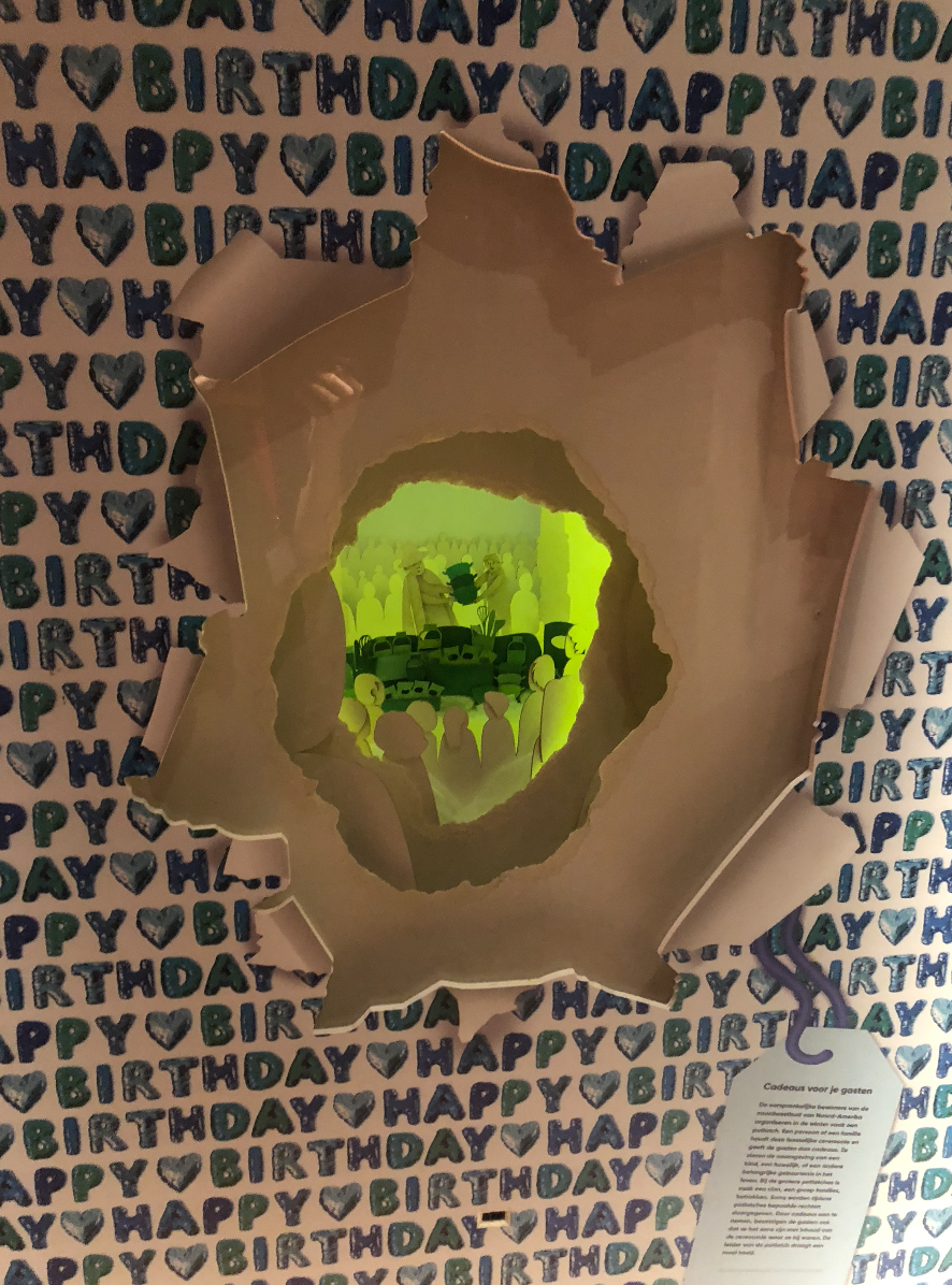 Cadeau, hoezo? was an interactive exhibition at the Tropenmuseum in Amsterdam, exploring the universal practice of gift-giving. For the final room, I created three installations to summarize the theme: large unpacked gifts with dioramas and film clips, along with a machine asking, “When is giving and receiving in balance?”